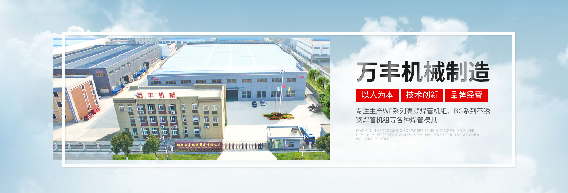 揚州萬豐機(jī)械制造有限公司坐落于揚州北郊槐泗工業(yè)園區(qū),占地25000平方米,交通便利,是集開發(fā)、制造、銷售為一 體的焊管機(jī)組、模具制造企業(yè)。主要生產(chǎn)WF系列高頻焊管機(jī)組;BG系列不銹鋼焊管機(jī)組;GW系列型材冷彎成型機(jī)組;CQ系列車圈機(jī)以及各種焊管模具(12機(jī)組至508機(jī)組)型材模具。采用ISO9001: 2000國際質(zhì)量標(biāo)準(zhǔn),擁有完善的質(zhì)量保證體系、嚴(yán)格的管理制度、先進(jìn)的檢測手段和完善的售后服務(wù)隊伍。公司秉承“以人為本、技術(shù)創(chuàng)新、品牌經(jīng)營、追求品質(zhì)”的發(fā)展理念。堅持質(zhì)量立企和品牌興企的發(fā)展戰(zhàn)略與時俱 進(jìn),將人才和先進(jìn)的管理、完善的設(shè)計與服務(wù)相結(jié)合。不斷開發(fā)與創(chuàng)新使我們的產(chǎn)品始終處于同行前列地位,同時也得到國內(nèi)了外廣大用戶的信賴和盛贊。 成功始于誠信,實力鑄就品牌,服務(wù)創(chuàng)造未來。二十一世紀(jì)是科技經(jīng)濟(jì)高速發(fā)展的時代。競爭與發(fā)展并存,機(jī)遇與挑戰(zhàn)同在。萬豐人將以“忠誠、務(wù)實、拼搏、創(chuàng)新”為企業(yè)精神,以敏銳的目光昂揚的姿勢面向一個更加廣闊的市場和未來。